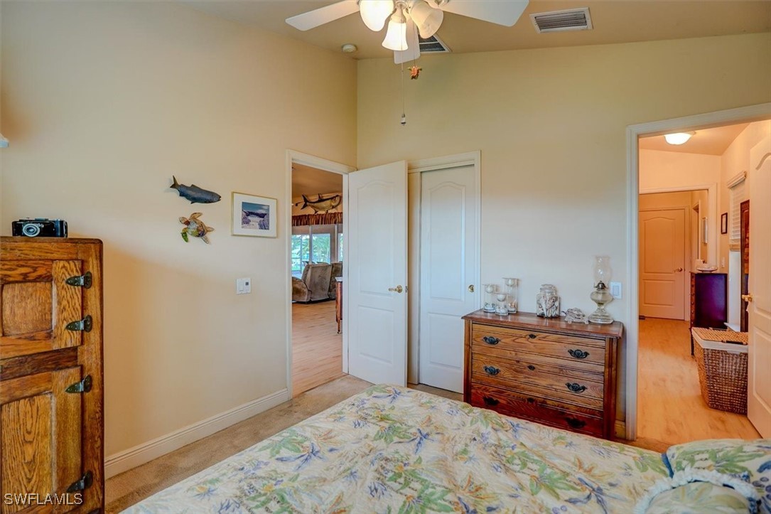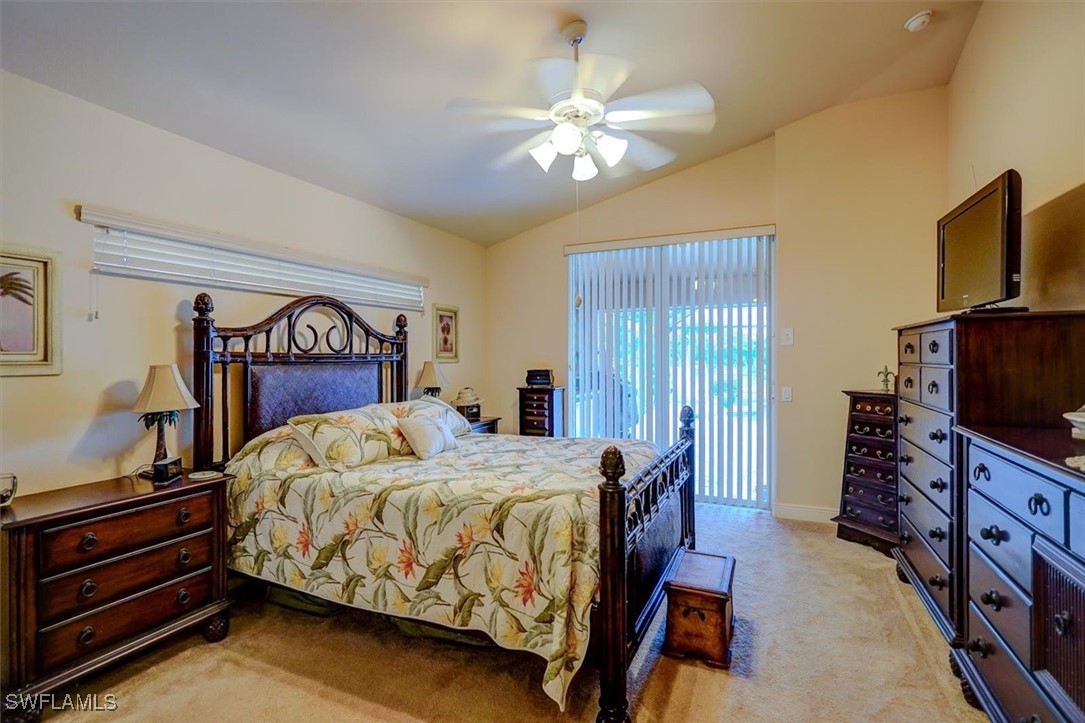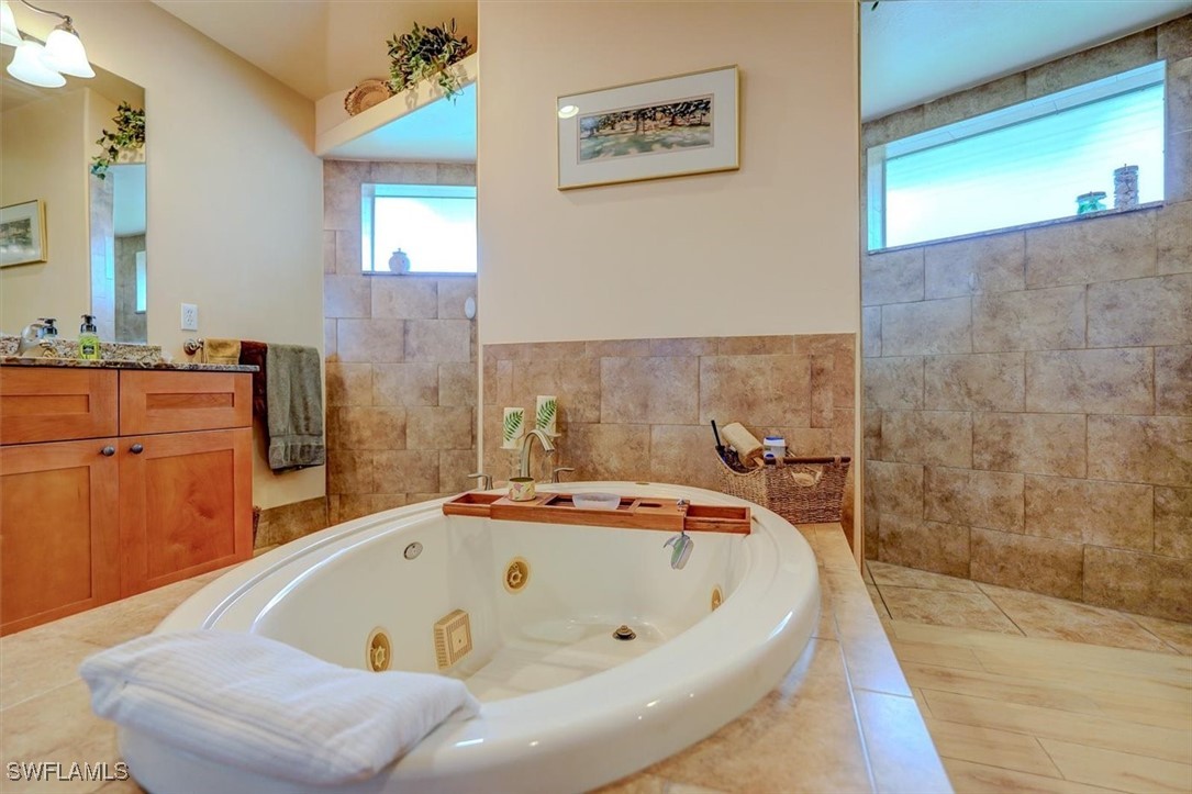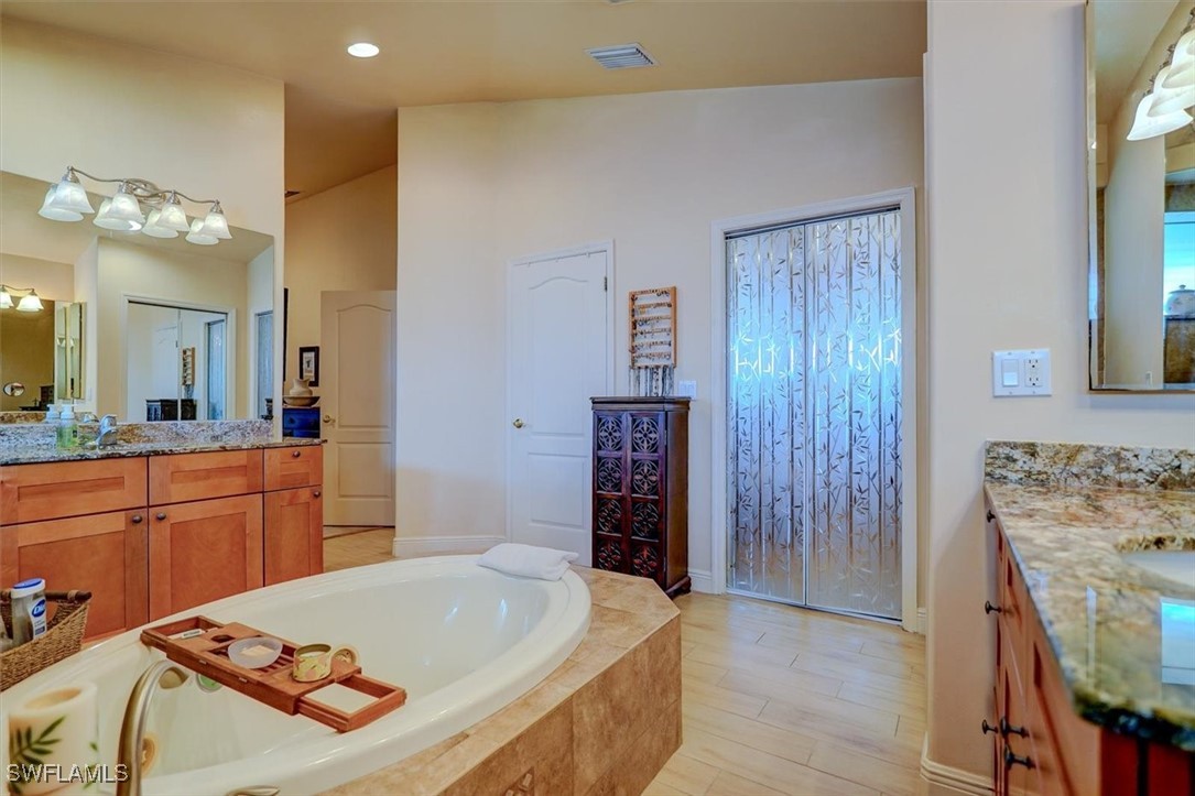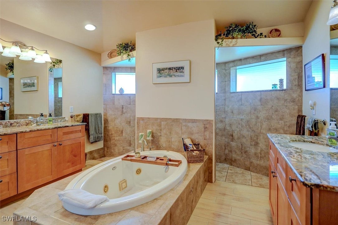 The ample Primary suite features dual closets, sliding glass doors to the lanai, and bathroom that features dual vanities, both a soaking jetted tub and walk through shower feature inspiring your next Spa Day at home.