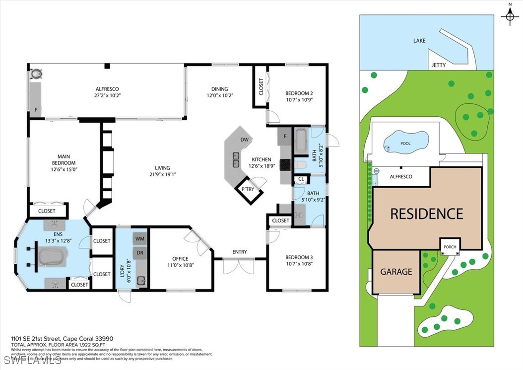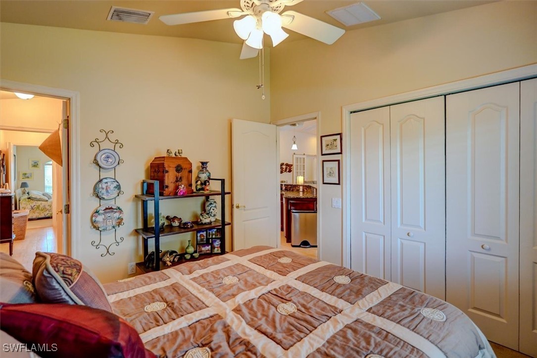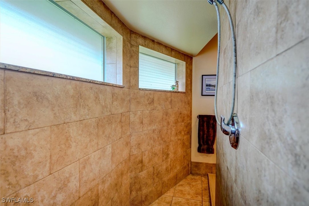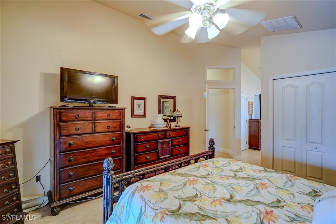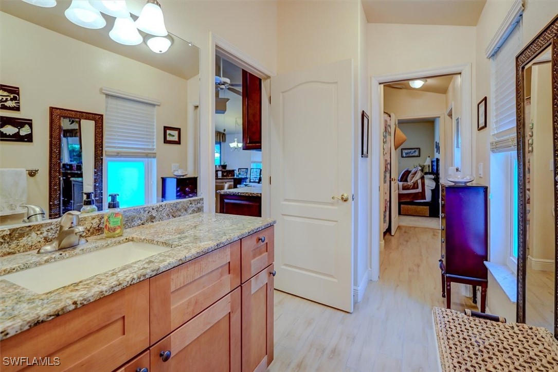 The ample Primary suite features dual closets, sliding glass doors to the lanai, and bathroom that features dual vanities, both a soaking jetted tub and walk through shower feature inspiring your next Spa Day at home.