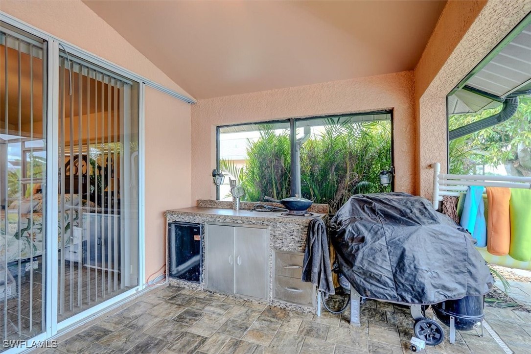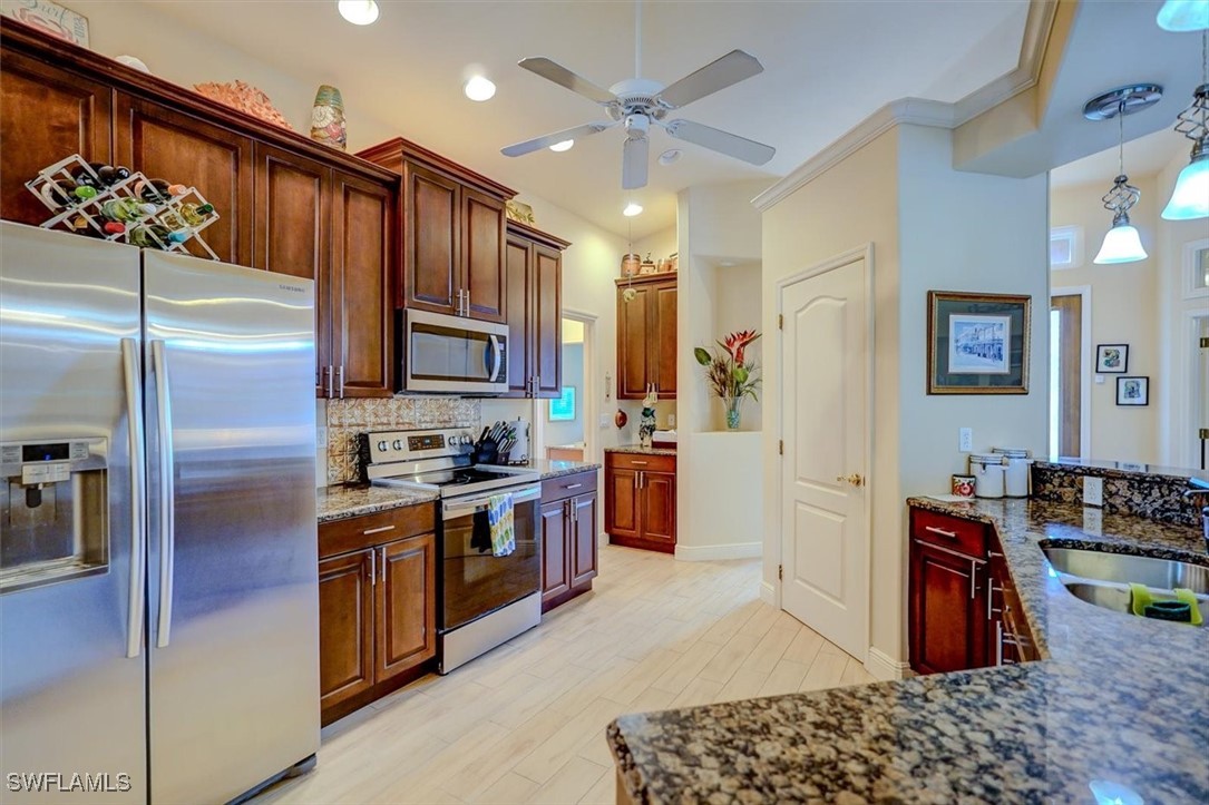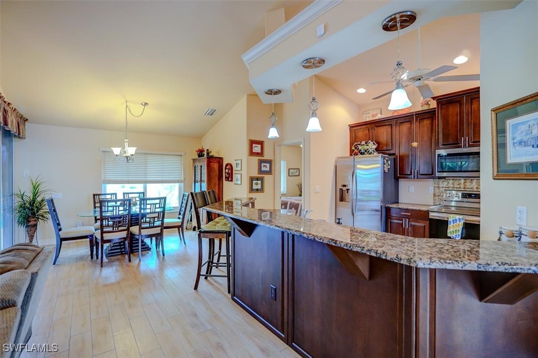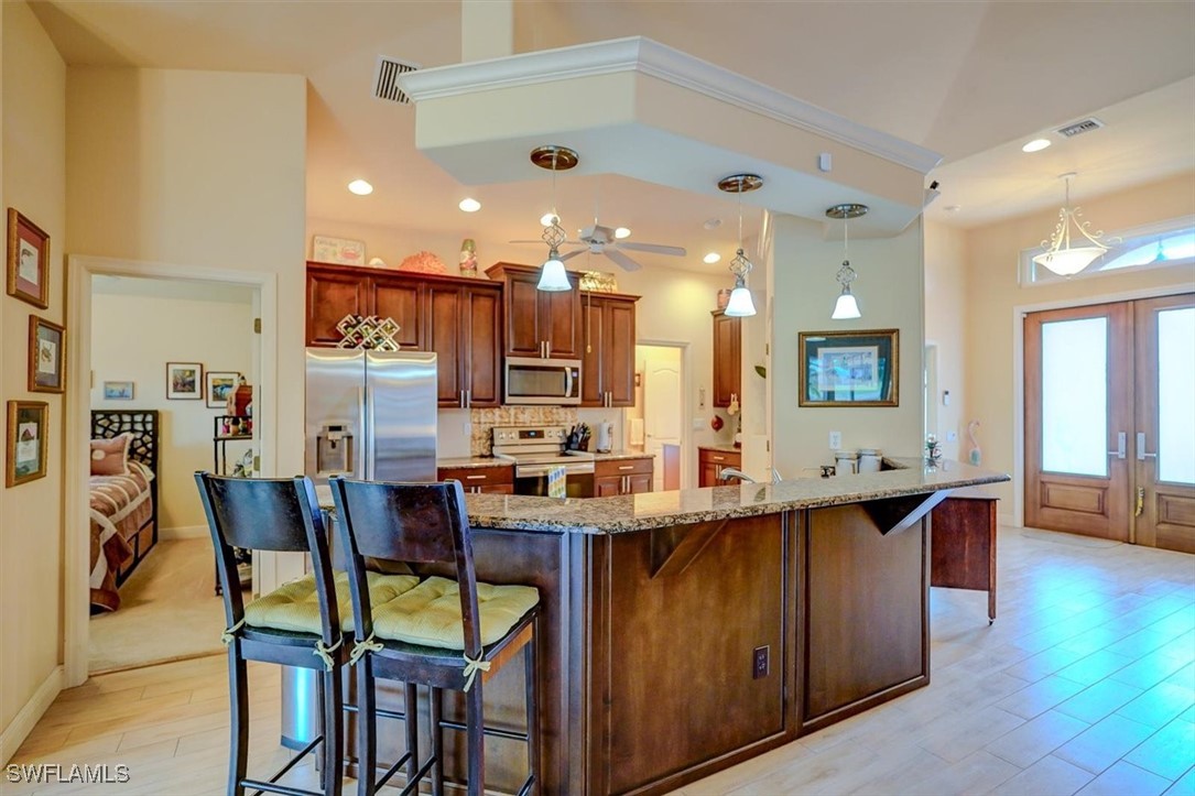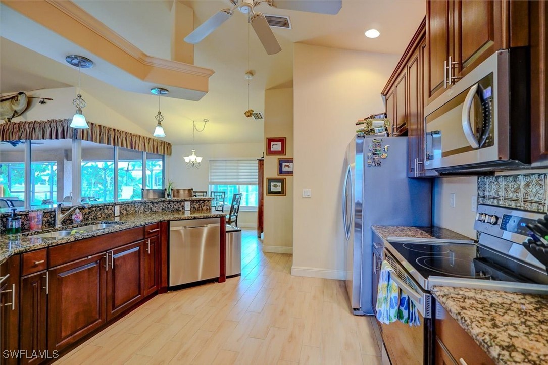 This home offers 3 bedrooms, 2 full bathrooms, and a den. The remodeled kitchen is a chef's delight, with granite countertops, wood cabinets, and an eat-in island--ideal for gatherings. Stainless steel appliances complete the space, ready to inspire your inner chef. The 90-degree sliding glass doors lead to the spacious lanai, where you can relax or entertain. Enjoy the solar-heated pool or simply take in the serene water views.