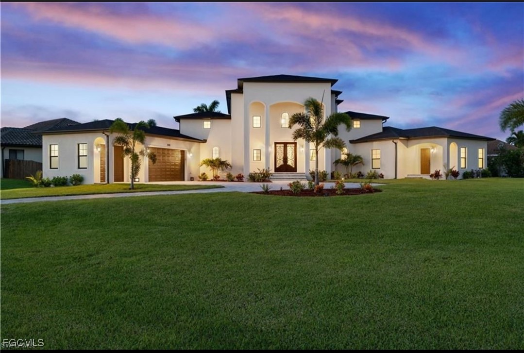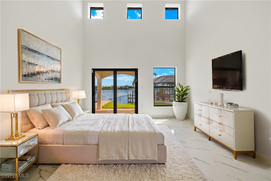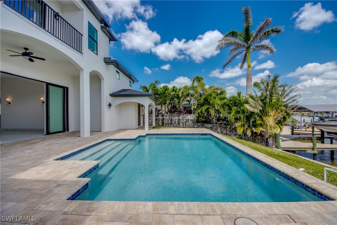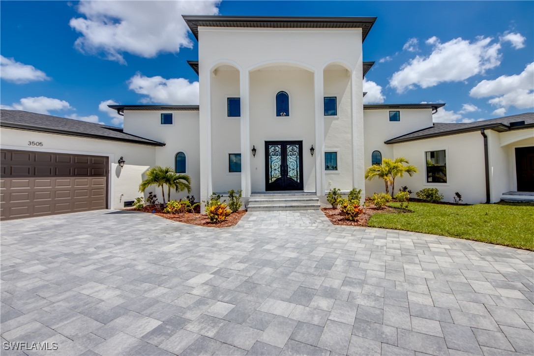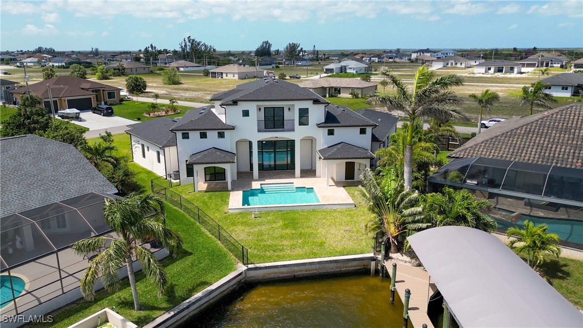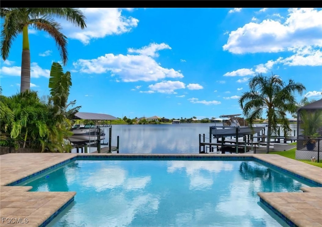 DIRECT GULF ACCESS, NO Bridges, Custom New construction that situated on a prime corner lot with direct sailboat access (no Bridges) and breathtaking views of Meadow Lake. This exceptional new construction pool home offers nearly 5,000 sq. ft. of indoor and outdoor living space. Designed for comfort, entertaining, and ultimate Florida living, this estate showcases soaring 23-foot ceilings, a dramatic custom wrought iron staircase and entrance doors, and a spacious great room with panoramic views of the lake and pool--creating a stunning focal point for both gatherings and relaxation. This home boasts 5 spacious bedrooms and 4 bathrooms, including two luxurious primary suites--one upstairs with a private balcony, cozy sitting area, and spa-like bath with rainfall shower and body jets, and another on the main level with direct pool access. The chef's kitchen is a culinary dream, featuring a 6-burner gas cooktop, 36" gas range, custom wood cabinetry, premium stainless steel appliances, a wine fridge, and a wet bar perfect for entertaining. Three additional guest bedrooms are located on the main floor, including one with a private exterior entrance and full guest bath. An expansive screened lanai leads to the 14x22 saltwater pool and spa, equipped with premium Hayward systems and a lifetime transferable warranty on the Pebble Tech finish. Additional highlights include a 3-car garage, a fully fenced yard ideal for pets, and a solid concrete construction with impact-resistant doors and windows. The home is equipped with a three-zone, high-efficiency Rheem HVAC system with a 10-year transferable warranty, providing long-term comfort and peace of mind.